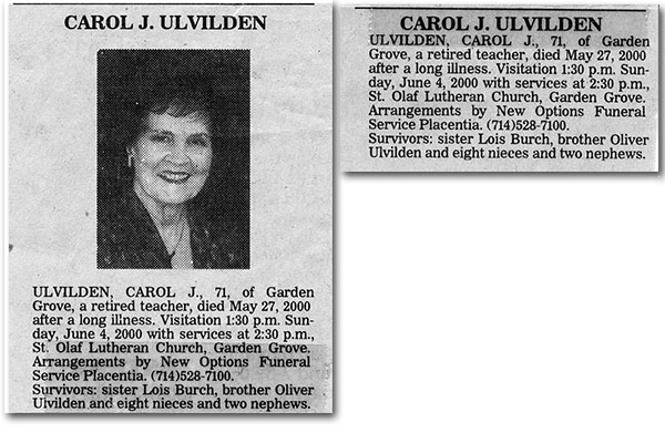 Ulvilden, Carol J., 71, of Garden Grove, a retired teacher, died May 27, 2000 after a long illness. Visitation 1:30 p.m. Sunday, June 4, 2000 with services at 2:30 p.m., St. Olaf Lutheran Church, Garden Grove. Arrangements by New Options Funeral Service Placentia. (714) 528-7100.
